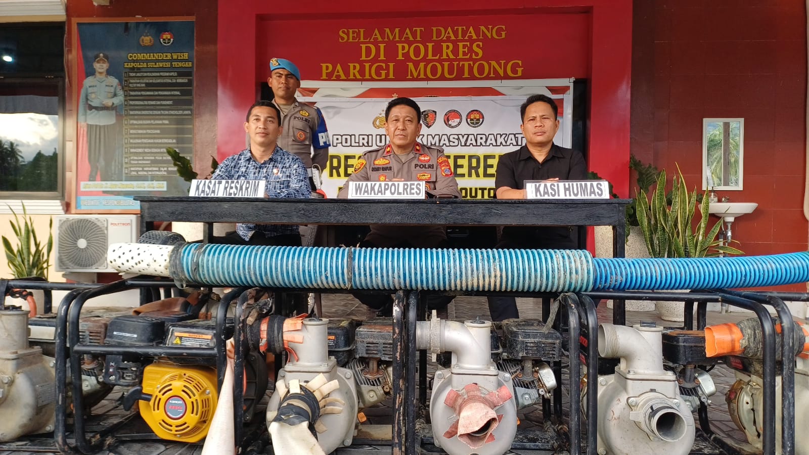 Wakapolres Parimo Kompol Romy Gafur mengatakan, dari tangan pelaku polisi menyita tiga unit mesin Alkon, dua lembar karpet talang penyaring emas, serta potongan selang spiral berwarna biru.
