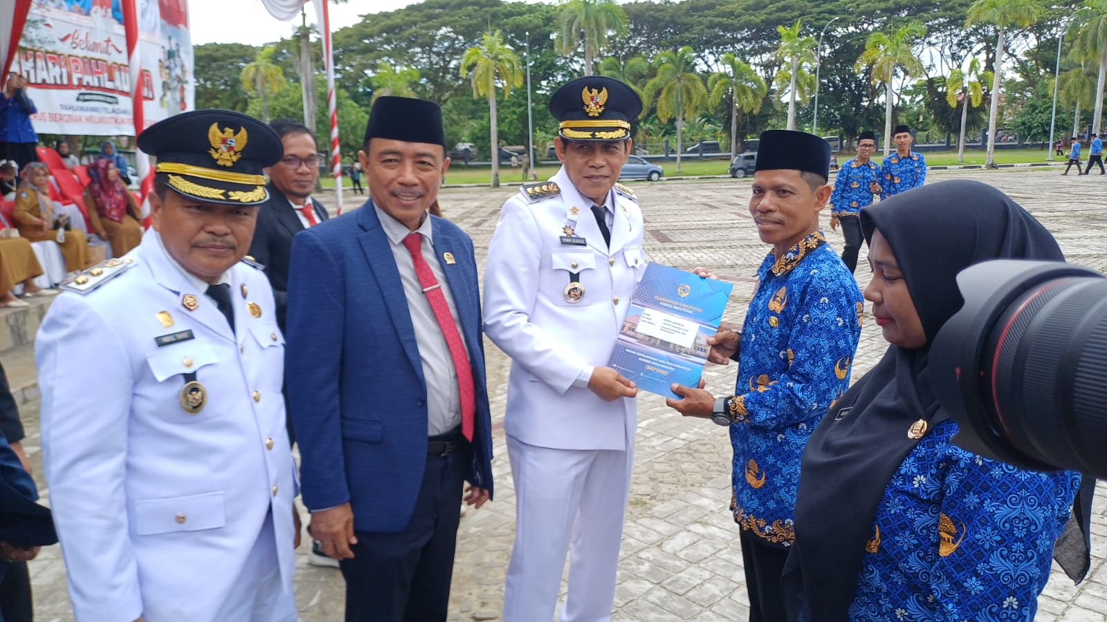 Bupati Parigi Moutong, H. Erwin Burase ,menyerahkan secara simbolis SK pengangkatan P3K tahap II formasi tahun 2024, Wakil Bupati, H. Abdul Sahid, dan Ketua DPRD Alfres M. Tonggiro, usai upacara peringatan Hari Pahlawan Nasional di halaman Kantor Bupati Parigi Moutong, Senin (10/11/2025). (Foto : Doc: parimoaktual.com)