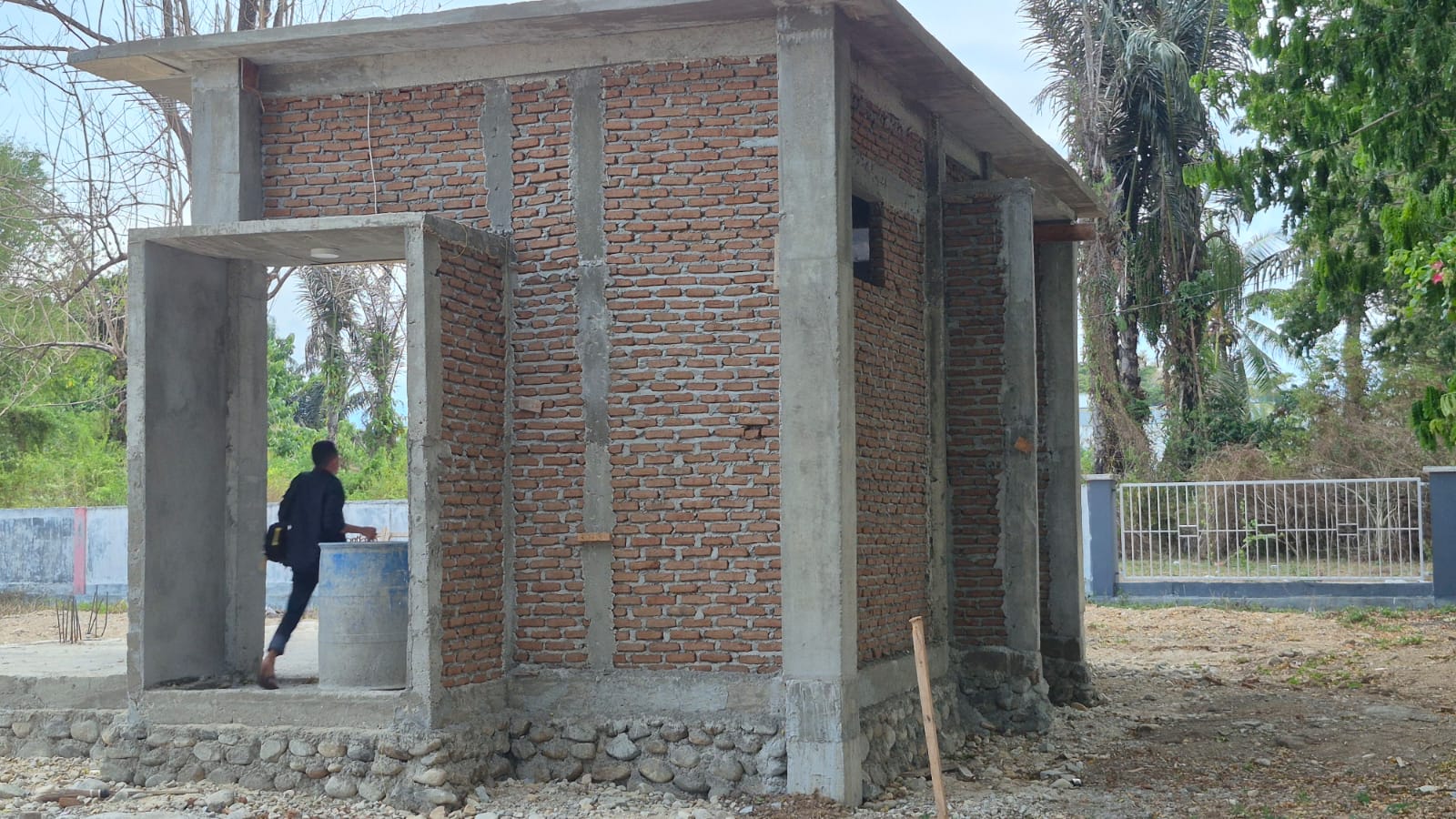 Hasil pantauan menunjukkan pekerjaan baru mencakup pondasi, tiang cor, serta dinding utama yang belum diplester bagian luarnya, sehingga bangunan tersebut belum dapat difungsikan sebagaimana mestinya.